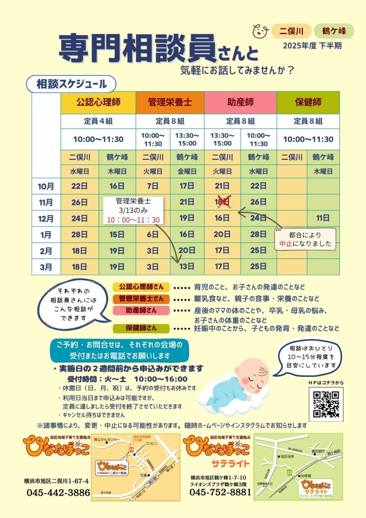 11月18日㈫二俣川の助産師さんの相談は、都合により中止になりました。