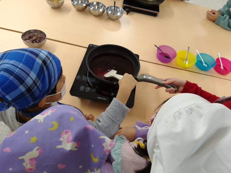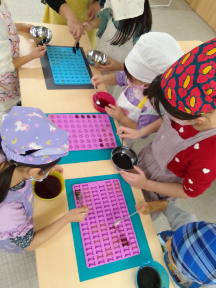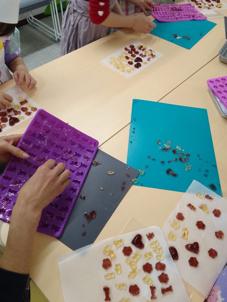 講師のおやつ~こ・こ~さんのお話を聴いて、みんなで協力して🍎グミ🍇を作ったよ。