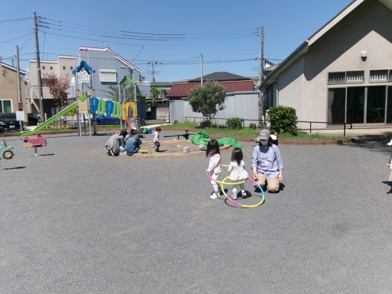 ひなたぼっこのそとあそびには、お砂場にシャボン玉、輪投げにフラフープ、電車に絵本、楽しいあそびがたくさん