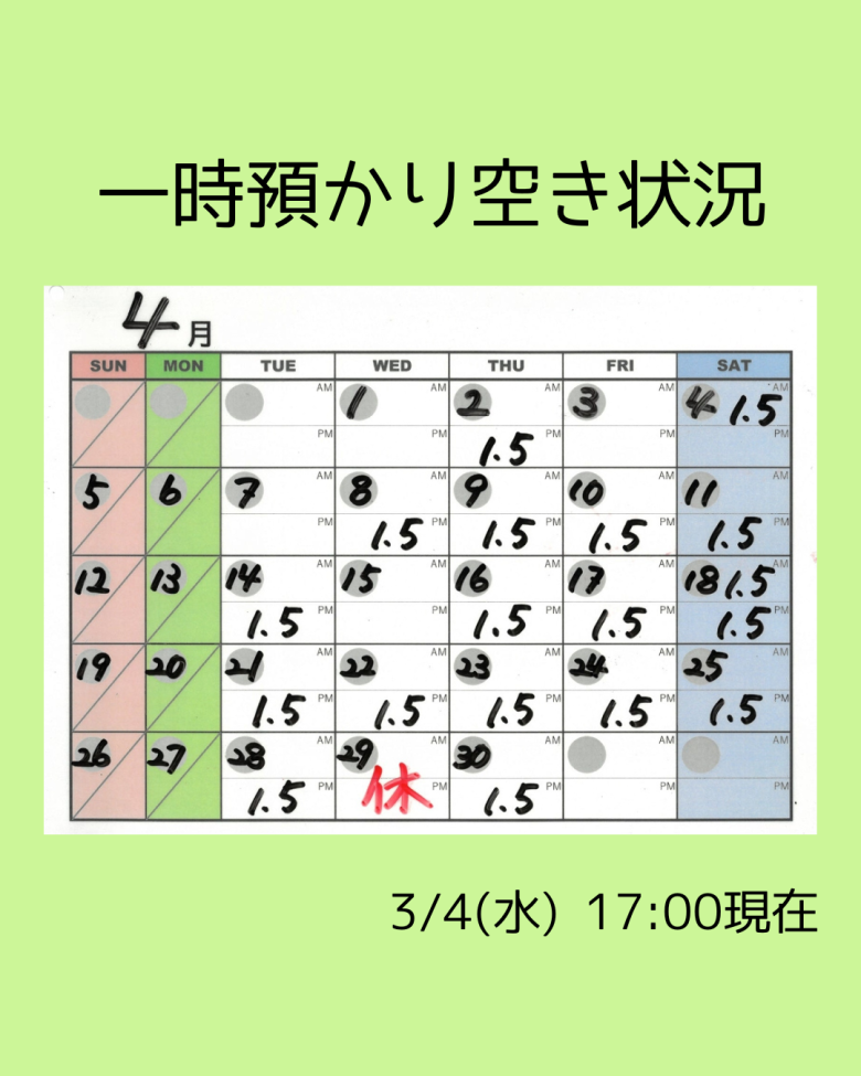 🌸3~4月の一時預かり空き状況🌸 【3/4 17:00現在】