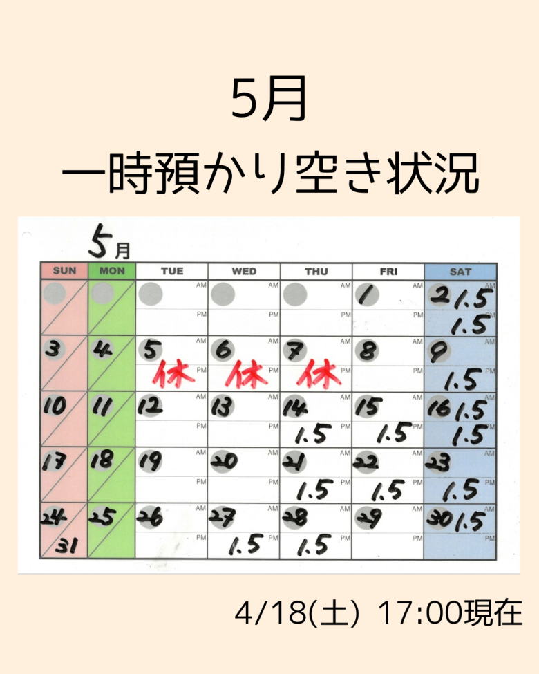 🌸5月の一時預かり空き状況🌸 【4/18(土) 17:00現在】